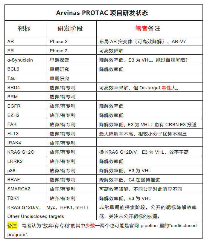 Arvinas是业界翘楚,其对PROTAC有极其丰富的实践经验和深度思考,从Arvinas的管线变迁,能够窥得一斑。笔者整理了Arvinas公司布局过PROTAC专利的靶标,对比其在研项目进展,相信对读者有所裨益。
