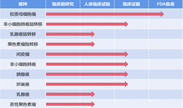在癌细胞分裂的中期,电场影响纺锤体微管的形成,导致染色体分离异常,使癌细胞无法分裂直至凋亡;在癌细胞分裂末期,电场将电荷推向分裂细胞颈部,破坏癌细胞结构,最终导致细胞死亡。与正常细胞相比,肿瘤细胞对电场相对更加敏感。并且癌细胞生长的速度非常快,因此在生长时,肿瘤细胞对外电场的反应更加显著。根据细胞特性,电场治疗设置一定强度的电场,即可精准杀伤肿瘤细胞,几乎不损害正常体细胞。电场疗法原理是靶向杀伤所有快速生长的癌细胞,因此,理论上适用于所有实体肿瘤。安全无创:电场疗法只需要患者佩戴贴在体表的传感器阵列,可以在家中使用该设备正常生活,目前发现的最主要副作用是皮肤刺激。持久有效:由于电场和传统的任何治疗方式都不同,不具有药物的半衰期,也不会像药物产生耐药性,因此只要24小时佩戴电场,电场就能不分昼夜,在治疗过程中不断递送,持续起效,阻止癌细胞分裂。精准破坏癌细胞:电场可以选择性的干扰产生高电荷物质的处于快速增值分裂期的癌细胞,导致其进入细胞自杀程序式死亡,而对于静止期及分裂期的人体正常细胞无明显影响。Clinicaltrials.gov网站上显示肿瘤电场疗法正在多种肿瘤中进行临床实验,如胶质母细胞、胰腺癌、胸膜间皮瘤、肺癌等。各肿瘤电场疗法研究进展如下图:一项2017年公布的研究中纳入了695例胶质母细胞瘤患者,其中,接受电场疗法+替莫唑胺治疗的患者,中位无进展生存期为6.7个月,中位总生存期为20.9个月;而仅接受替莫唑胺治疗的患者,中位无进展生存期为4.0个月,中位总生存期为16.0个月。PANOVAⅡ期临床试验纳入了40例晚期胰腺癌患者,其中20例接受电场疗法加吉西他滨, 电场疗法+吉西他滨治疗的晚期胰腺癌患者中位无进展生存期为8.3个,中位总生存期为14.9个月,在吉西他滨的历史对照中,分别为3.7个月和6.7个月,均延长两倍以上。一项重磅Ⅱ期临床试验致力于研究肿瘤治疗电场在结合每周一次紫杉醇时对于复发性卵巢癌的疗效。该研究是一项前瞻性的单臂创新研究,以探究电场疗法在治疗复发性卵巢癌的可行性、安全性和初步疗效。研究发现,接受TTFields治疗的患者,无进展生存期(PFS)延长至8.9个月,而对照组患者PFS仅为3.9个月,显著延长了患者生命。2023年1月5日,美国Novocure公司宣布,肿瘤电场疗在铂类化疗后进展的晚期非小细胞肺癌,达到了主要终点。最终的研究结果显示:与单独使用化疗或者免疫治疗相比,电场疗法联合治疗组均显著改善了晚期非小细胞肺癌患者的总生存期,并且参加该研究的实验组的患者对电场疗法的耐受性良好。TTFields是一种创新的、非侵入性的肿瘤治疗方法,开拓了肿瘤治疗的新领域,为肿瘤治疗提供了新方向和新思路。临床试验多次表明TTFields结合化疗或者靶向治疗更有效而不增加毒副反应,使TTFields可作为与化疗之间的桥梁,但其作用机制尚未完全明确,仍需进一步深入研究并阐明。凭借独特的抗癌机制及优越的疗效,电场疗法被国际著名癌症期刊《Clinical Cancer Research》誉为除手术、放疗及药物治疗肿瘤治疗的“第四种新方式”。2011年,FDA批准电场疗法用于复发的胶质母细胞瘤;2016年,FDA批准电场疗法用于新诊断的胶质母细胞瘤;2019年2月,美国电场疗法正式在中国香港上市,被批准用于胶质母细胞瘤。2020年5月,NMPA批准用于治疗组织学证实的复发性多形性胶质母细胞瘤(GBM)的成年患者(22岁或以上),以及与替莫唑胺联合治疗新诊断胶质母细胞瘤。中文名--爱普盾。日本:被诊断为恶性胶质瘤(GBM)的患者,在手术后完成放化疗治疗,之后联合化疗使用。硼中子捕获治将含有 10B 的亲肿瘤靶向硼药注入患者体内,硼药选择性地聚集于肿瘤细胞内;再使用热中子或超热中子束从患者体外进行照射;中子被硼俘获后发生10B(n,α)7Li 反应,其反应产物 α 粒子 和 7Li 粒子在生物组织中的射程为5μm-9μm,与细胞直径近似,可选择性地有效杀死肿瘤细胞。被癌细胞吸收硼化合物时普通细胞的三倍,具有普通辐射三倍生物效应的射线精准破坏癌细胞DNA。不仅可杀死富氧细胞,也可杀死乏氧细胞及处于静止期细胞。通过名为FBPA-PET的核医学检查,可以提前确认硼药剂在癌细胞中的聚合程度。由此判断硼药剂会被肿瘤吸收多少。对于侵入性,多发性,复发性,抗辐射性,不能手术的癌症,以及放射治疗适应不良的癌症都可以尝试硼中子俘获治疗。只进行1-2次治疗,每次30至60分钟。时间短顺应性好。目前,BNCT在日本上市治疗复发性头颈癌,多种肿瘤如血管瘤、胶质瘤、恶性和色素瘤也进入临床。有研究纳入7项针对手术及常规放疗或放化疗后复发无法手术的局部晚期头颈部肿瘤给予BNCT治疗的临床研究(日本5项、芬兰1项和中国1项)。该项研究中BNCT治疗患者的中位生存期为13.1个月,BNCT治疗后患者生存期较EXTREME研究中化疗(CTX组)或化疗联合靶向治疗(CTX/C225组)显著延长(P<0.0001)。BNCT治疗、CTX/C225组和CTX组的中位PFS分别为7.5、5.6和3.3个月, 缓解率分别为76%、36%和20%(P=0.001)。BNCT治疗显示出良好的疗效及较传统化疗更轻的毒副作用。日本最新一项多中心II期临床研究共纳入27例复发恶性胶质瘤患者,入组患者采用10B-boronophenylalanine(SPM-011)为含硼药物利用回旋加速器超热中子源(BNCT 30)进行BNCT治疗。研究结果同既往用贝伐珠单抗治疗复发胶质瘤的临床研究(JO22506)进行对比 。该项研究结果显示BNCT