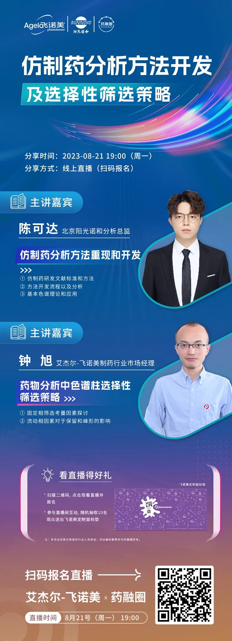 如何在基于原研药研发文献标准和方法,确定方法开发流程以及分析的重现和方法优化,从而保证仿制药的药理学活性、做到药品稳定性和安全性的优化和验证,是当下立足仿制药市场一个需要深入探究的话题。2023年8月21日19:00,艾杰尔-飞诺美携手北京阳光诺和药物研究股份有限公司共同带来“仿制药分析方法开发及选择性筛选策略“主题报告分享,一同探索仿制药的世界。