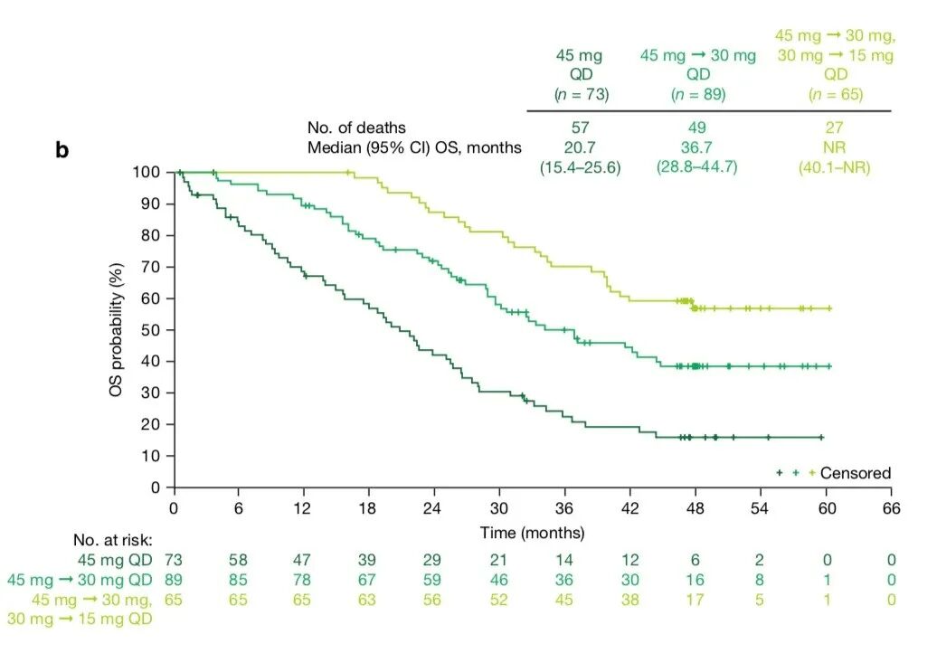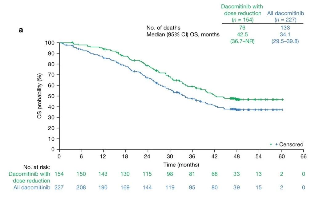 根据患者基因突变类型进行分析,19del突变患者中,达可替尼组和吉非替尼组的中位OS分别36.7个月 vs. 30.8个月;21 L858R突变患者中,两组中位OS分别为32.5个月vs. 23.2个月。除此之外,研究还发现,达可替尼剂量降低后,并不影响患者的OS获益。