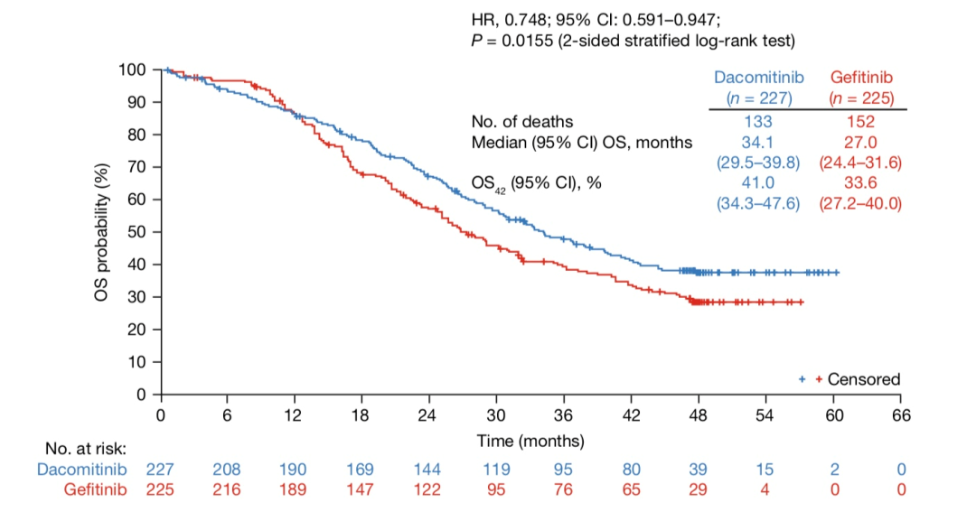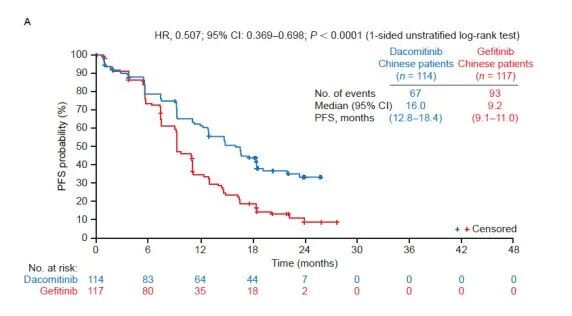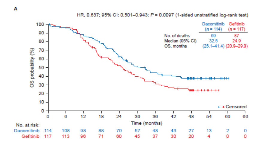 根据患者基因突变类型进行分析,19del突变患者中,达可替尼组和吉非替尼组的中位OS分别33.2个月 vs. 25.9个月;21 L858R突变患者中,两组中位OS分别为26.7个月vs. 23.2个月。