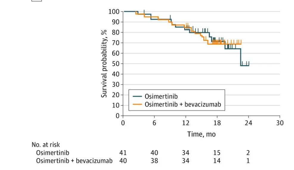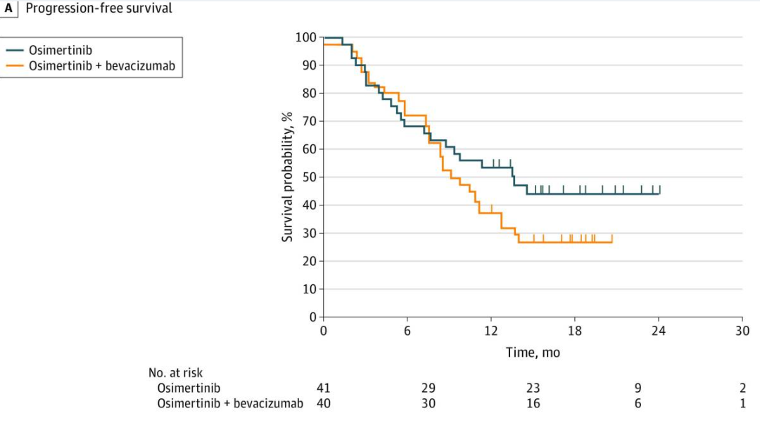 WJOG-8715L研究[12]:这是一项II期随机对照研究,观察奥希替尼与贝伐单抗联合后线治疗T790M阳性患者的疗效(二线治疗)。共纳入81例患者,联合治疗组和奥希替尼单药组分别入组40例和41例患者。但多个参数均是在联合治疗组更差。中位PFS在联合治疗组和单药奥希替尼组分别为9.4个月和13.5个月 (HR1.44, 95%CI, 1.00-2.08, P=0.20),也就是说,在奥西替尼治疗的基础上联合贝伐单抗治疗,竟然将疾病的进展风险提高了将近1.5倍。两组的OS数据相似,分别为未达到和22.1个月(P=0.96),仅ORR在联合治疗组更优,两组分别为68%和54%。BOOSTER研究[13]:是一项开放标签、II期、随机对照临床研究。纳入患者分别接受奥希替尼(80mg qd)联合贝伐珠单抗(15mg/kg q3w)或奥希替尼单药治疗。主要研究终点为研究者评估的PFS。由2017年5月至2019年2月,纳入155例患者随机分组接受奥希替尼+贝伐珠单抗(n=78)或奥希替尼单药治疗(n=77)。中位随访时间为34个月。研究结果:PFS(奥希替尼+贝伐珠单抗 vs 奥希替尼):15.4个月 vs 12.3个月,HR=0.96,95% CI 0.68-1.37,P=0.83;mOS:24.0个月 vs 24.3个月,HR=1.03,95% CI 0.67-1.56,P=0.91;ORR:55% vs 55%。亚组分析:吸烟史与治疗的PFS和OS显著相关(校正P=0.0052和0.029);≥3级治疗相关AEs:47% vs 18%。结果显示奥希替尼联合贝伐珠单抗二线治疗EGFR(敏感突变合并T790M突变)晚期NSCLC患者不能延长OS和PFS。