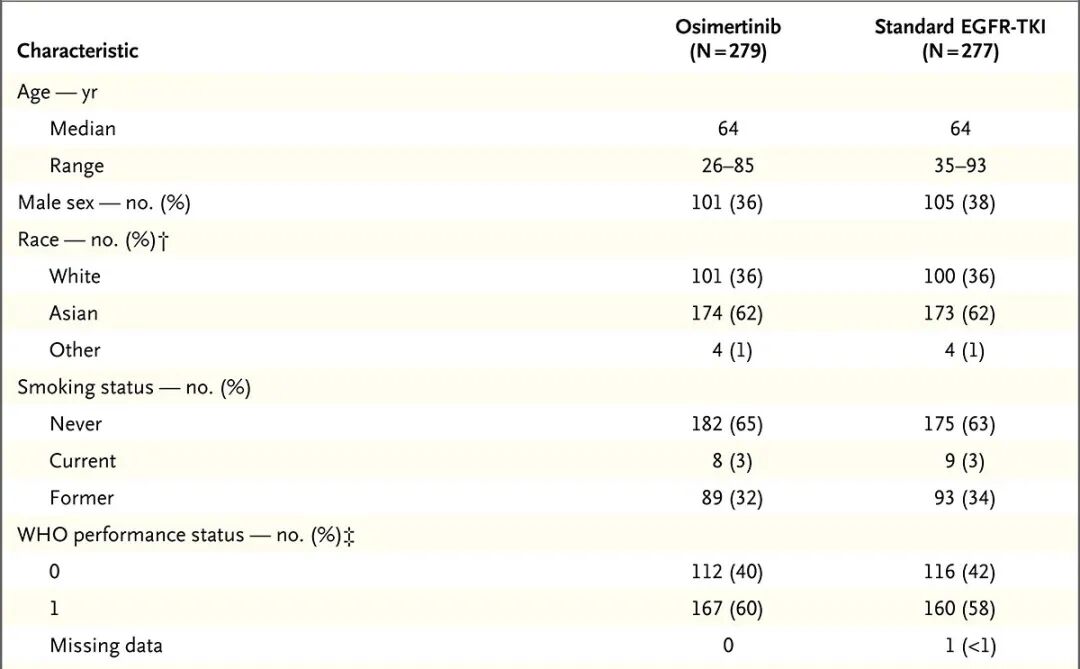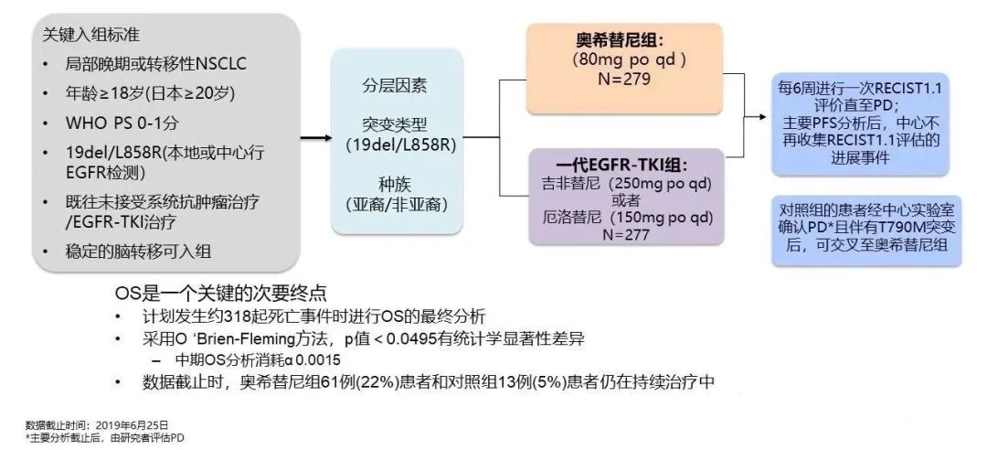 最终数据截止时,有415例患者至少接受一次研究药物治疗。奥希替尼组和化疗组分别有279例和136例患者,73%的接受含铂双药化疗的患者进展后,交叉接受奥希替尼治疗,两组之间基线特点均衡可比。中位治疗暴露时间分别为13.8个月和4.3个月。数据分析时,两组分别有10%和0%的患者仍然接受研究药物治疗。最终数据分析时,奥希替尼组和化疗组分别有67%和66%的患者出现死亡事件。两组分别有21%和19%的患者仍然进行生存随访。