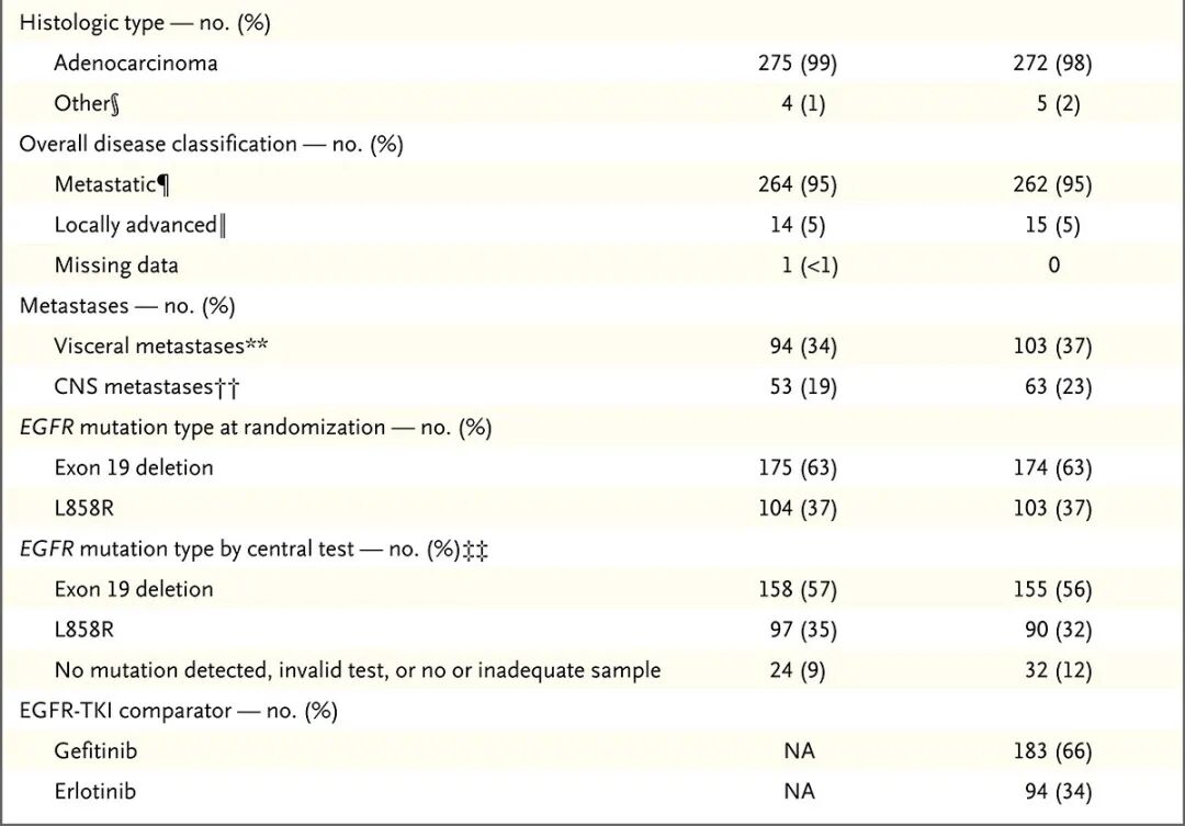 2019年5月30日至2019年12月5日期间,纳入358例患者随机分配到伏美替尼治疗组(178例)和吉非替尼组(180例)。吉非替尼治疗组有1例患者未接受药物治疗,因此未被列入研究的全分析集(Full Analysis Set)。研究组和对照组患者的基线特征均衡。分别有35%和32%伴有中枢神经系统(CNS)转移;EGFR L858R人群在两组中的比例皆为49%。