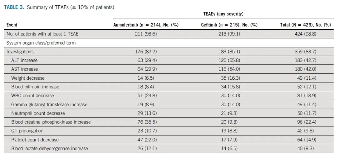 安全性:安全性分析结果与既往报道一致,未出现新的安全性信号。两组分别有85%和89%的患者出现不良反应,其中3度以上不良反应发生率分别为9%和34%。奥希替尼组间质性肺疾病以及肺炎的发生率分别为2%和3%,其中分别有1%和2%的间质性肺疾病以及肺炎考虑和研究药物有关。两组分别有4%和1%的患者,因不良反应导致死亡。