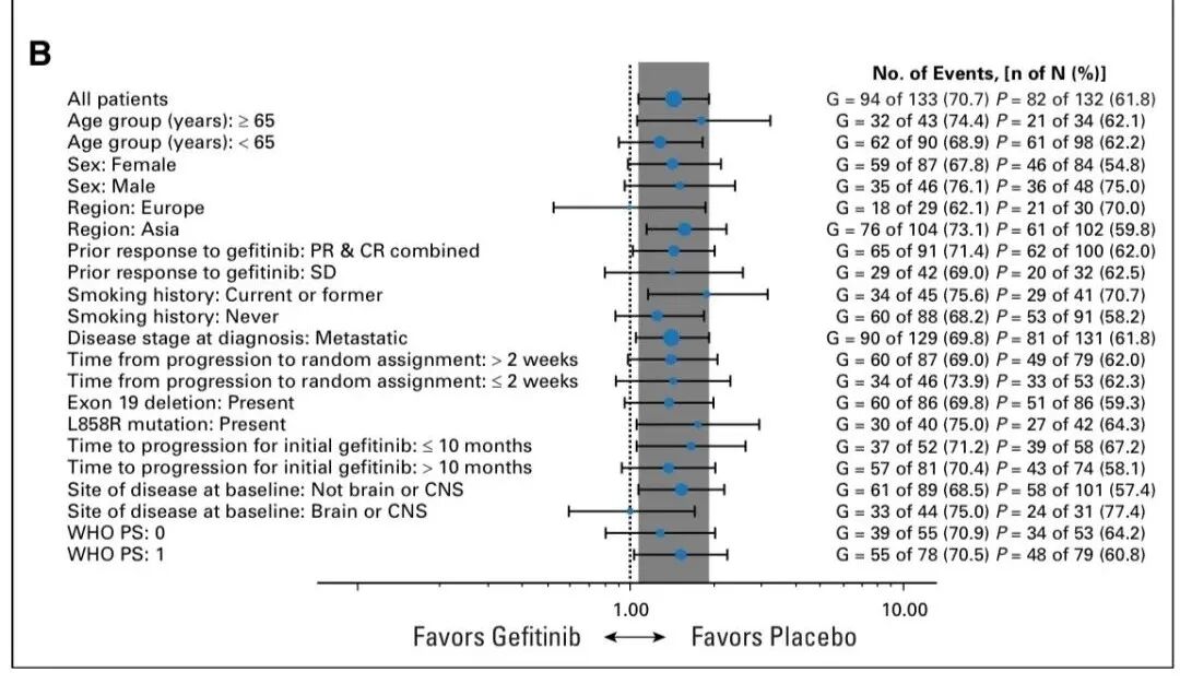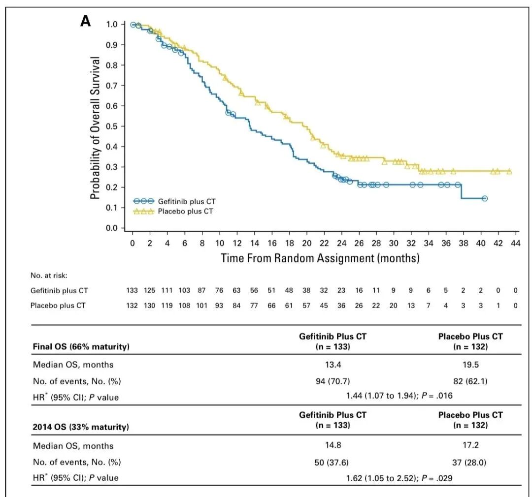 研究结果:265例患者按1:1随机分到吉非替尼组(133名)和对照组(132名)。结果显示两组患者PFS无统计学差异(HR=0.86,95%CI 0.65-1.13,P=0.273);吉非替尼组的OS劣于对照组(风险比1.44, 95%CI 1.07-1.94, P=0.016,中位OS 13.4月vs19.5月)。亚组分析结果与总体结论一致。IMPRESS研究结果表明EGFR突变阳性晚期NSCLC患者TKI一线治疗耐药后继续一代TKI治疗PFS无获益,OS受损。