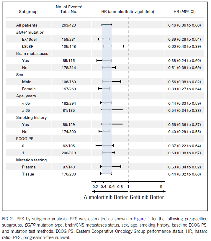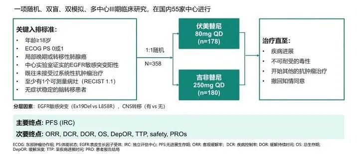 AENEAS研究[10]:是一项随机、双盲、Ⅲ期研究,旨在评估阿美替尼vs 吉非替尼一线治疗局晚期或转移性NSCLC的疗效与安全性。主要纳入标准包括:经组织学或细胞学证实的携带EGFR突变(敏感突变,如外显子19缺失或L858R突变)的局晚期或转移性NSCLC;除辅助/新辅助治疗外,不允许既往接受过全身治疗,且不允许既往接受过EGFR抑制剂治疗;在基线时,要求患者至少有一个可测量的病灶(≥10mm)等。患者按1:1随机分配接受阿美替尼110mgQD或吉非替尼组250mg QD治疗,并根据EGFR突变类型(外显子19缺失或L858R突变)和CNS转移状态分层。治疗持续至疾病进展(PD)、撤回同意或出现不可耐受的毒性等。吉非替尼组中EGFR T790M突变的患者可交叉至阿美替尼组接受治疗。