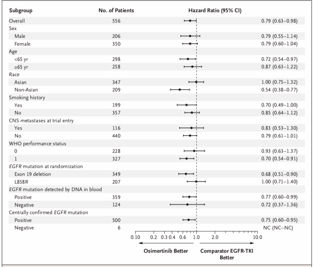 分层分析中多数亚组观察到奥西替尼中生存获益,观察到使用奥希替尼的总体生存获益。而且每个亚组生存获益的大小各不相同,在亚洲患者以及L858R突变亚组中危险比接近1.0【2020ESMO丨肺癌,靶向治疗最新进展汇总,中国数据显示OS延长】亚洲患者的K-M生存曲线显示有奥西替尼早期获益趋势并一直持续大约3年的时间。作为研究的第二终点,本研究亚洲人群亚组分析数据不足以进行OS的分析。换言之,在亚洲人群一线用于NSCLC总生存是否获益还不得而知。此前的研究已经证实,EGFR T790M突变的患者奥西替尼比其他EGFR-TKIs治疗更有效。因此,该研究允许对照组交叉至奥西替尼组,这可能导致对照组的mOS延长(31.8mo)。之前的研究显示,一线或二线使用EGFR-TIKs治疗的mOS在18-28个月之间。最近的ARCHER 1050研究显示吉非替尼和达克替尼治疗的mOS分别为26.8mo vs 34.1mo。但ARCHER 1050研究和FLAURA不同,其并没有包括CNS转移的患者,而CNS转移意味着更短的生存期。FLAURA研究允许被证实EGFR T790M突变阳性的患者疾病进展后交叉到奥西替尼组接受二线治疗。疾病进展后,使用第一、二代EGFR-TKIs后将近50%的患者会出现EGFR T790M,从而为接受奥西替尼二线治疗创造了一个生物驱动因素。在真实世界有报道25-39%的患者接受一、二代EGFR-TKIs治疗后继续接受奥西替尼作为二线治疗。FLAURA研究对照组有31%(85/277例)患者交叉使用奥西替尼作为第一个后续治疗。两组中接受的后续治疗基本与治疗指南推荐相一致。奥西替尼组的大多数患者第一次后续治疗为化疗,而对照组中交叉使用奥西替尼是最常见的一种后续治疗。两组中接受另一种含EGFR-KTIs(不包括奥西替尼)方案的比例相似。两组接受第二次后续治疗病人的比例相似,接受的治疗类型也相似。在这两组中,约30%的患者中断了试验药物,也没有接受第一次后续治疗,因为其中约70%的患者死亡。数据与之前接受EGFR-KTIs治疗的研究结果一致。在EGFR突变的NSCLC患者中,诊断时即发现约25%的患者出现CNS转移,将近50%的患者诊断3年内出现CNS转移。FLAURA前期研究的结果表明,奥西替尼对于CNS转移也是有活性的。18个月时无进展生存率奥西替尼组和对照组分别为58% vs 40%(疾病进展风险[HR],0.48;95% CI,0.26-0.86)。了解一线治疗后的耐药机制和确定适当治疗方法,分子耐受机制是重要的考量因素。初步数据表明,奥西替尼一线治疗耐药机制与接受奥西替尼作为二线治疗T790M突变的患者耐药机制类似。这种耐药机制也与使用一、二代EGFR-KTIs耐药的少见突变(除T790M以外)类似。一项II期ELIOS研究正在进行更深入的研究(NCT03239340)。基于接受一线奥西替尼治疗后耐药的最佳治疗模式的两项研究-ORCHARD研究和SAVANNAH-也正在进行。总之,将奥西替尼用于EGFR突变NSCLC的一线治疗比较其他EGFR-TKIs可以获得更长的总生存,且安全性相似。AURA3亚组分析:奥希替尼、化疗组CNS转移中位PFS(11.7个月vs 5. 6个月)和ORR(70%vs 31%);FLAURA亚组分析:奥希替尼组的中位PFS(未达到vs 13. 9个月)和ORR(66%vs43%)均显著优于标准治疗组。2020年《JCO》发表了在韩国进行的一项多中心、单臂、开放标签、II 期临床研究,评估奥希替尼治疗非经典突变患者的疗效及安全性[8]。研究共纳入36例患者,61% 患者接受奥希替尼一线治疗。突变类型为G719X (n = 19; 53%)、L861Q (n = 9; 25%)、S768I (n = 8; 22%) 和其他 (n = 4; 11%)。研究结果显示,客观缓解率为50%、中位无进展生存期为 8.2 个月、中位缓解持续时间为 11.2 个月、中位总生存期未达到。一项研究:日本进行的一项前瞻性研究[9],评估了PDL1表达水平对奥希替尼治疗EGFR突变晚期NSCLC患者的影响。纳入了71例患者,PDL1≥50%(15)、1-49%(26)、<1%(30)。结果显示,PD-L1高表达的患者与 PD-L1低表达或阴性的患者相比,奥希替尼治疗的客观反应率和疾病控制率显着降低(分别为 P=0.043 和 P=0.007)。此外,在接受奥希替尼治疗的患者中,PD-L1高表达的患者相对于PD-L1低表达或阴性的患者表现出更短的PFS(中位 PFS:5.0 与 17.4 个月;P<0.001)。
