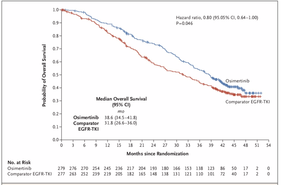 556例未经治疗的晚期肺癌患者(EGFR突变:exon 19 del. or L858R)1:1随机分配为两组治疗:奥希替尼组和其他EGFR-TKIs。研究不排除CNS转移症状稳定的患者。所有患者给予试验药物治疗直到病情进展或副作用不能耐受或患者主动退出试验。对照患者被证实疾病进展或T790M突变的患者允许交叉到非盲奥希替尼治疗。数据截止至2017年6月12日的前期FLAURA研究分析显示[6],奥希替尼组、第1代EGFR-TKIs组ORR相似(80%vs 76%),中位PFS(18.9个月vs 10.2个月),ADR(34%vs 45%)。2020年1月《N Engl J Med》公布了最终研究结果[7],奥希替尼一线治疗NSCLC的中位总生存是38.6个月(95% CI,34.5-41.8),对照组中位总生存是31.8个月(95% CI,26.6-36.0),(死亡风险[HR]=0.80;95.05% CI,0.64-1.00;P=0.046)。治疗3年后,奥希替尼组有79/279例(28%)以及对照组26/277例(9%)继续接受试验用药,中位时间分别为20.7个月 vs 11.5个月。奥希替尼组中有42%的患者报告了3级或更高级别的不良事件,对照组则为47%。讨论:FLAURA纳入的患者均为未经治疗的EGFR突变阳性的晚期NSCLC,这些患者接受奥西替尼治疗后获得更长的PFS、更长的OS。两组随访时间至少39个月,即使存在从对照组交叉到奥西替尼组的情况,奥西替尼组的中位总生存比对照组多6.8个月,降低了20%的死亡风险。此外,36个月时奥西替尼组继续接受试验药物治疗的患者是对照组的三倍。即使奥西替尼组的患者服药时间更长,但二者的不良事件发生率仍相似。