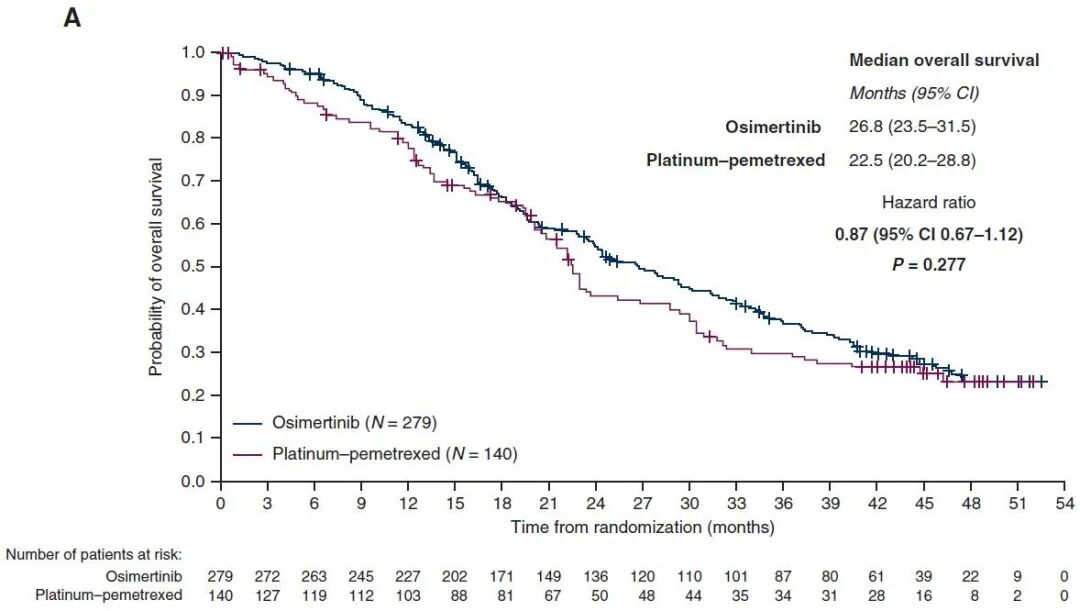 2020年《Ann Oncol》发布最终OS,两组中位随访时间分别为23.5个月和20.3个月。奥希替尼组和化疗组的中位OS分别为26.8个月和22.5个月,HR=0.87,P=0.277,差异无统计学意义。两组12个月OS率分别为83%和78%,24个月OS率分别为55%和43%,36%个月OS率分别为37%和30%(图2)。