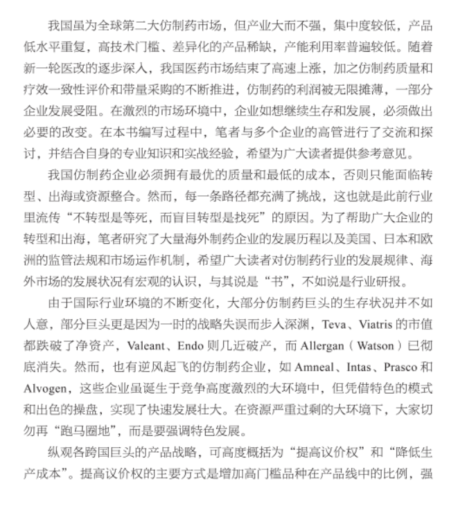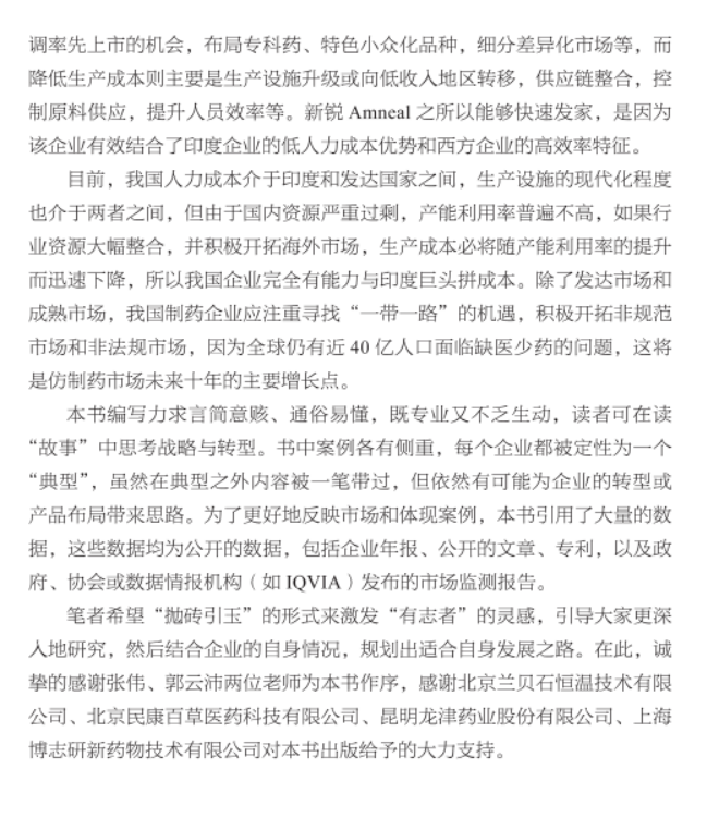 相比国际仿制药市场的激烈拼杀,曾经我国仿制药市场就像是一张巨大的温床,在这个温床之上快速成长,我国仿制药企业普遍缺乏国际竞争力,很多管理者也普遍缺乏国际化的操盘理念。随着形势的不断转冷,越来越多的管理者感到迷茫,对前途缺乏信心。迷茫的原因是战略不够清晰,缺乏信心的原因是企业缺乏竞争力。事实上,虽然我国市场在转冷,但形势依然好于美日,即便在美日那种高度竞争、仿制药价格极其低廉的市场环境之下,因为有新模式、新玩法,依然存在逆风起飞的仿制药巨头(如Amneal、Intas、Prasco 和Alvogen),有的甚至还是白手起家。所以尽管行业在洗牌,大家拿不到好牌不一定会失败,只是更加考验企业的出牌技巧,但事实上,很多人原本有一副好牌,却一步步把自己推向失败的深渊。所以一套聪明的出牌方法将是广大仿制药企业救命的稻草,而本书中大量的“他山之石”或许可为广大朋友开启一盏明灯。