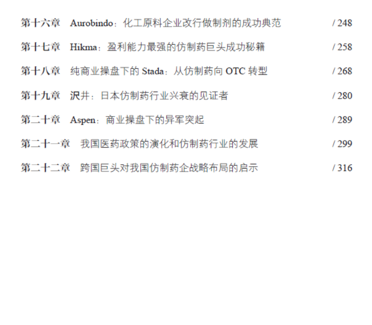 全书22个章节,近60万字,可分为三个部分,第一部(1-5章)讲述了仿制药的历史与意义,全球仿制药行业的兴衰与发展,简要阐述了仿制药行业的运营逻辑,美国、欧洲、日本仿制药的政策、法规的历史沿革,市场发展规律,当下的市场概况和未来的发展趋势,为仿制药的精细化操盘、出海提供理论基础。第二部(6-20章)讲述了15个仿制药企业在不同时代、不同生存环境下的生存技巧,发展战略。内容包含随形势而不断改变的风险评估,战略战术、操盘手法,产品线布局逻辑和兼并策略,用实际的案例为国内企业的转型、现代化操盘、战略或产品线布局提供正反面的参考。第三部(21-22章)则案例结合实际,讲述我国药品法规、政策的形成与沿革历程,市场发展规律及未来的趋势。最后结合国际、国内形势、跨国仿制药企业的成功经验与失败教训,以及我个人的知识与经验,进一步讨论我国仿制药企业的发展战略、转型策略和产品布局,并提出了方法和建议。