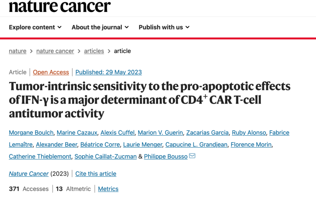 [1]Boulch, M., Cazaux, M., Cuffel, A. et al. Tumor-intrinsic sensitivity to the pro-apoptotic effects of IFN-γ is a major determinant of CD4+ CAR T-cell antitumor activity. Nat Cancer (2023).