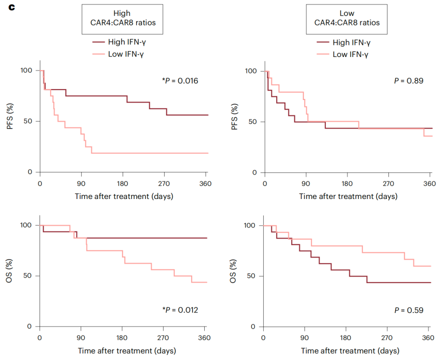结果发现,与CAR4和CAR8-T细胞比值较低的患者相比,CAR4和CAR8-T细胞比值高的患者血清中的IFN-γ浓度更高。在CAR4和CAR8-T细胞比值高的患者中,高水平的IFN-γ与患者无进展生存期(PFS)和总生存期(OS)显著改善有关。