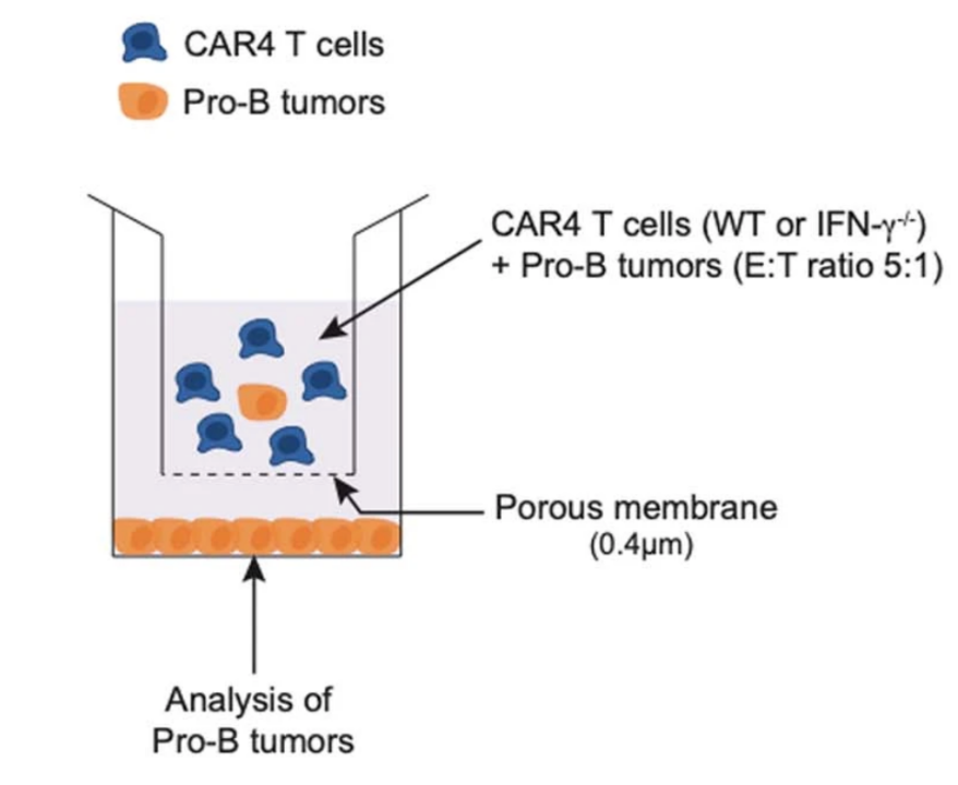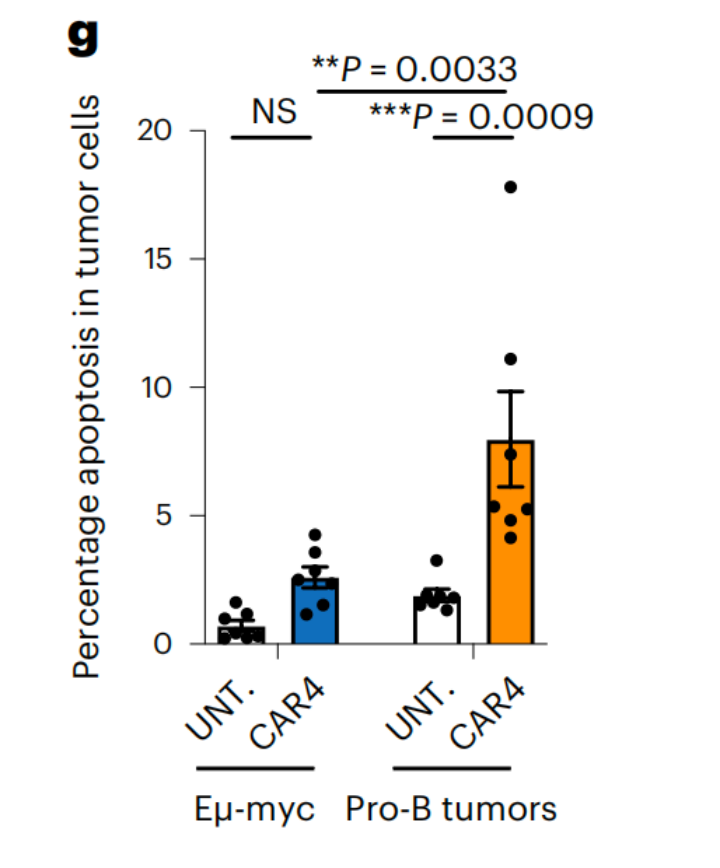 鉴于T细胞产生的IFN-γ是导致肿瘤细胞凋亡的关键,研究人员想知道CAR4-T细胞是否也是通过产生IFN-γ杀死肿瘤细胞的,于是使用了缺少IFN-γ(IFN-γ−/− )的CAR4-T细胞治疗B细胞急性淋巴细胞白血病小鼠。