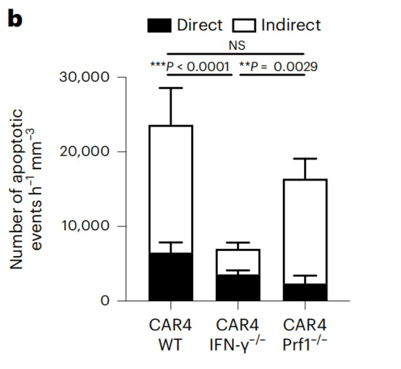 接下来,研究人员通过标记肿瘤凋亡事件,将其分类为与CAR4-T细胞有直接接触的直接杀伤事件,以及与CAR4-T细胞无直接接触的间接杀伤事件。在接受WT CAR4-T细胞治疗的小鼠中,仅有1/3的肿瘤细胞死于直接杀伤事件,绝大部分肿瘤细胞都死在了离CAR4-T细胞比较远地方,当使用IFN-γ−/−CAR4-T细胞治疗后,这种现象几乎消失了。